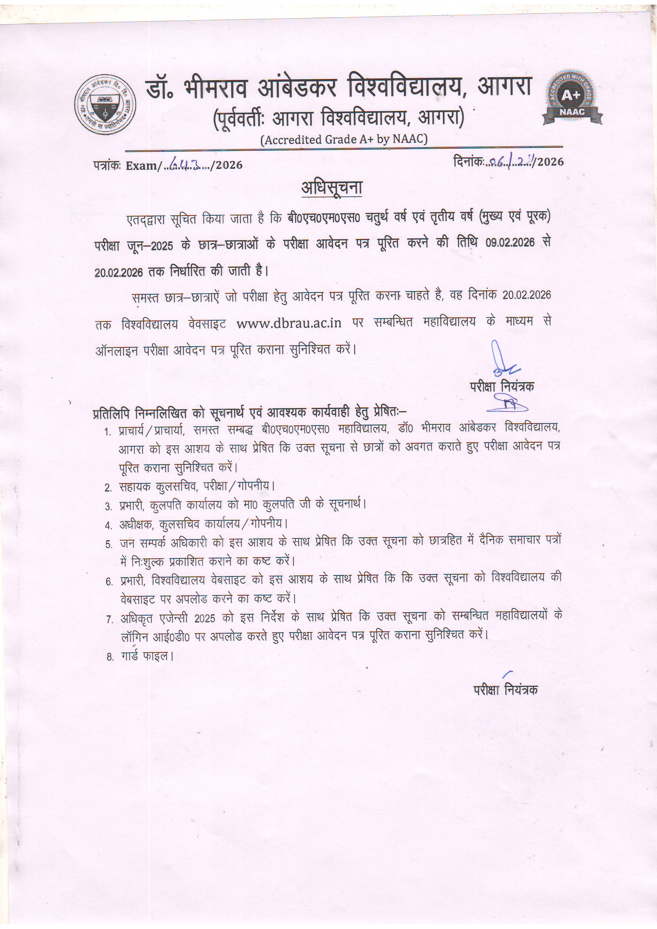 - [21-Nov-2025]: ## डॉ० भीमराव आंबेडकर विश्वविद्यालय, आगरा की विषम सेमेस्टर परीक्षाओं (नवम्बर/दिसम्बर-2025) की शुचिता एवं शांति व्यवस्था हेतु दिशा-निर्देश जारी करने का अनुरोध।