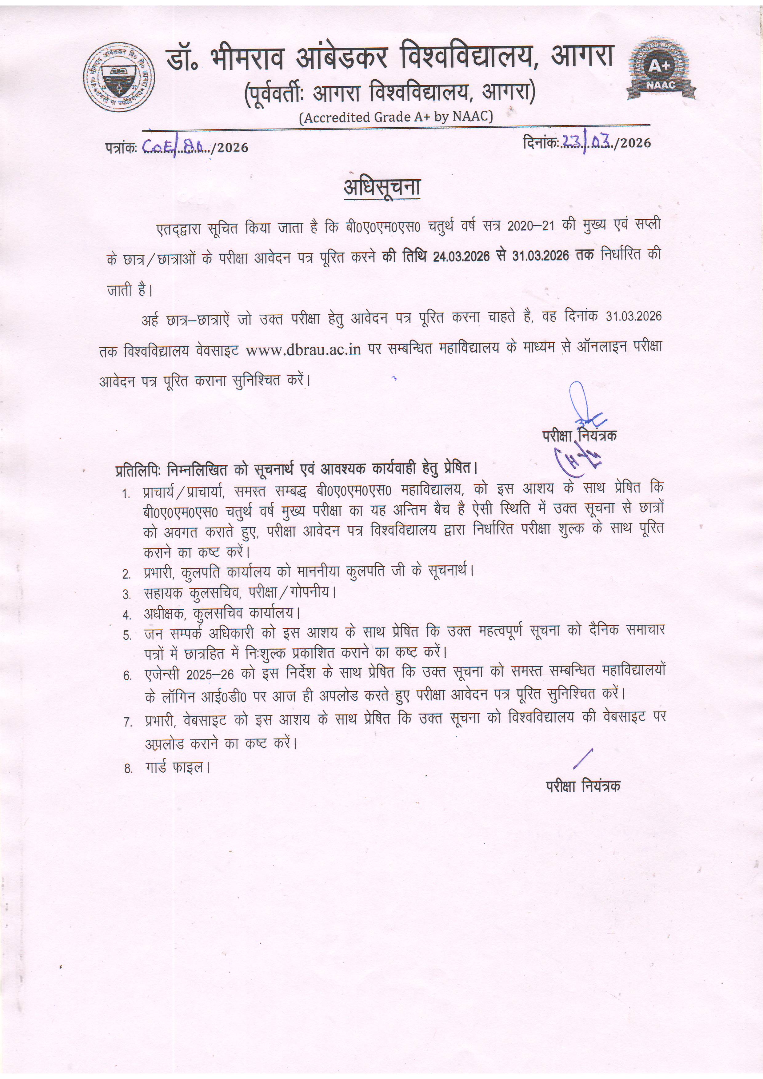 - ЁЯТб [23-Mar-2026]: बी०ए०एम०एस० चतुर्थ वर्ष (सत्र 2020-21) परीक्षा आवेदन सूचना मुख्य एवं सप्ली परीक्षा हेतु आवेदन पत्र भरने की तिथि 24.03.2026 से 31.03.2026 निर्धारित 23-03-26