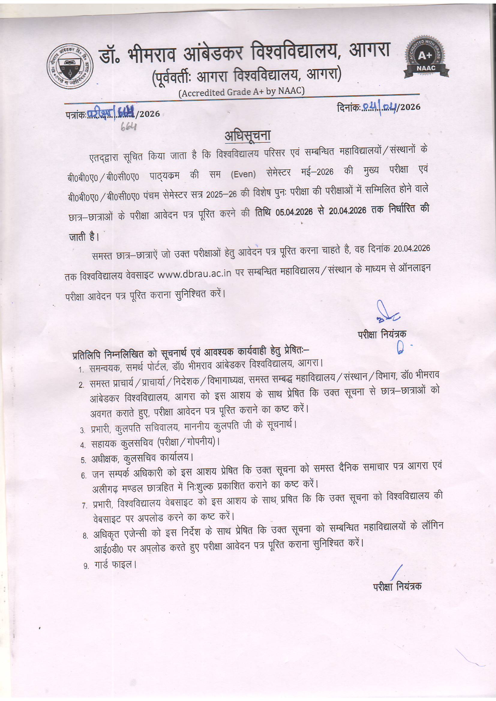 - [08-Apr-2026]: बीबीए/बीसीए सम सेमेस्टर मई 2026 परीक्षा आवेदन सूचना ऑनलाइन आवेदन तिथि: 05 अप्रैल 2026 से 20 अप्रैल 2026 तक 08-04-26