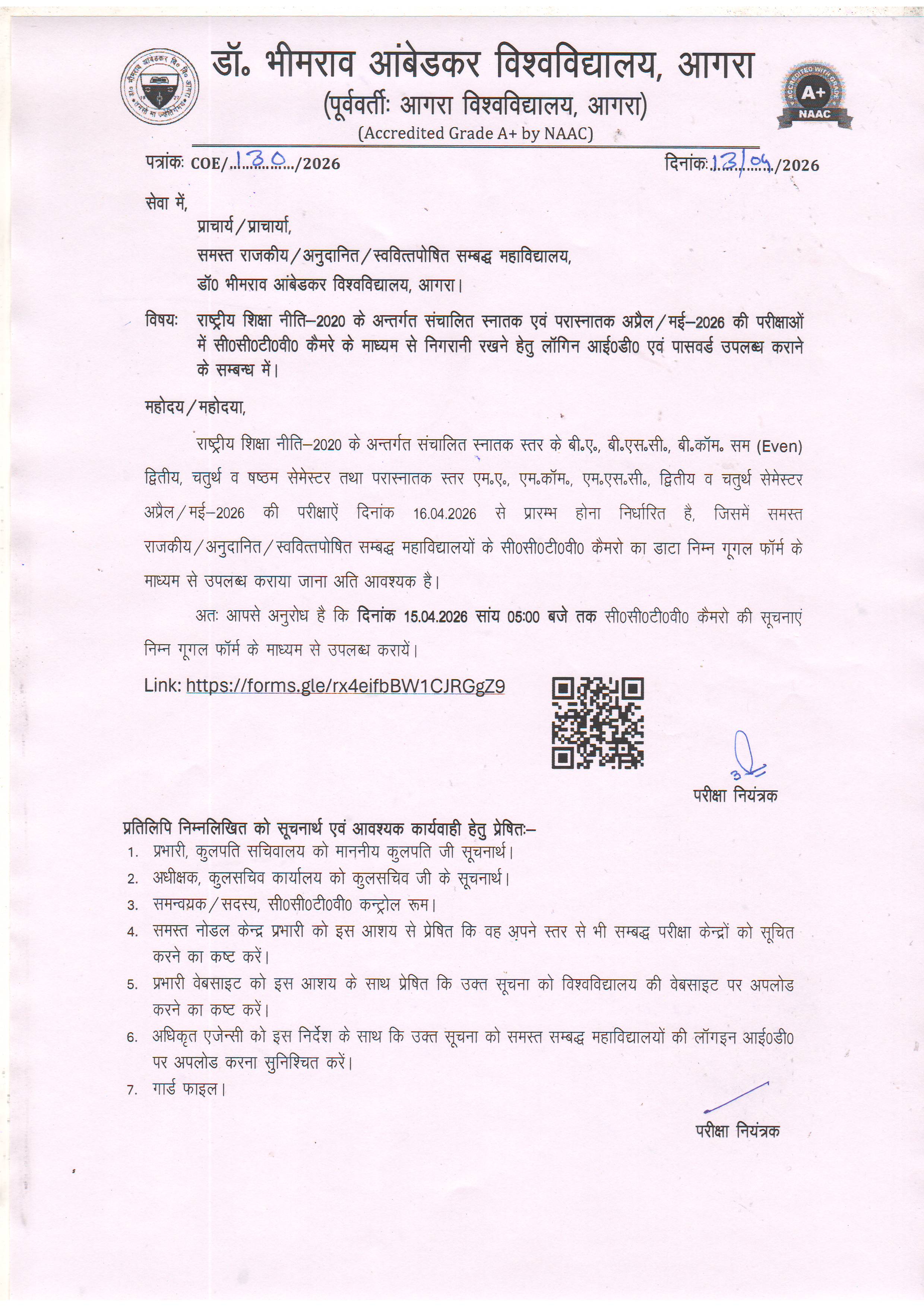 - [03-Oct-2023]: सत्र 2022-23 की बी.ए., बी.एससी. एवं बी.कॉम. (द्रितीय एवं चतुर्थ सेमेस्टर), परास्नातक (द्रितीय सेमेस्टर) एवं पुनः परीक्षाओं में सी.सी.टी.वी. कैमरे के माध्यम से निगरानी रखने हेतु लांग इन आई. डी. एवं पासवर्ड उपलब्ध कराये के समन्ध में |